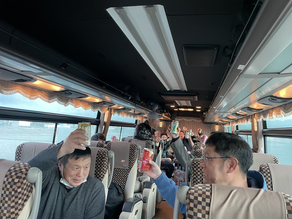 社長より挨拶をいただいてから、バス旅行の醍醐味。朝から乾杯をしました。朝6時半の出発でしたが、みんなとても元気です。