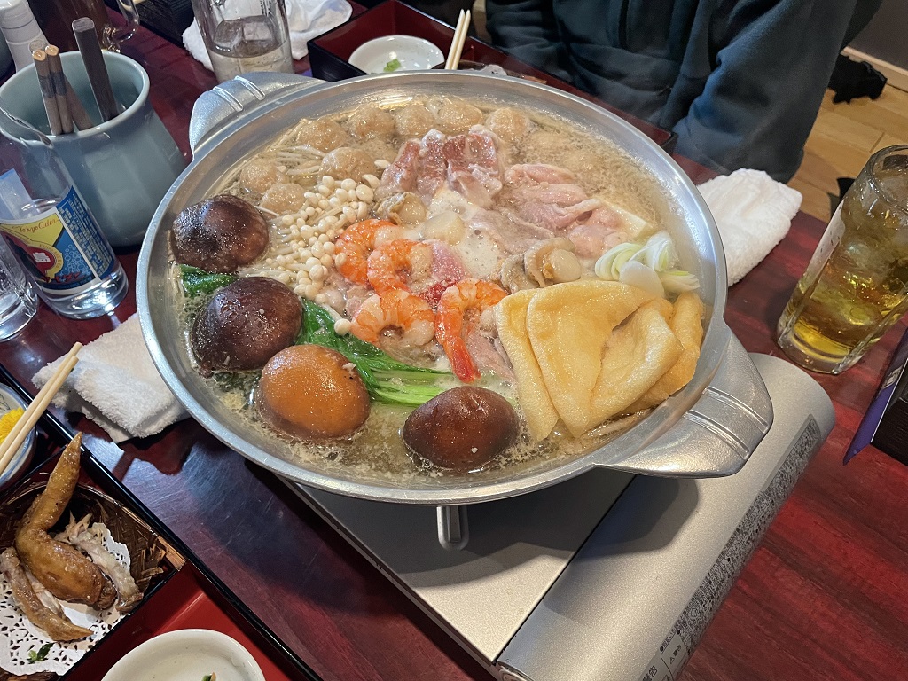 大相撲陸奥部屋直伝のちゃんこ鍋を頂きました。野菜も肉も魚も盛り盛りで、最初は食べきれるか心配でしたが、とてもおいしくて、〆のうどんまでしっかり完食できました。